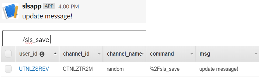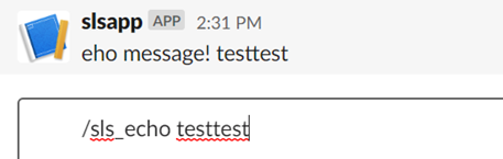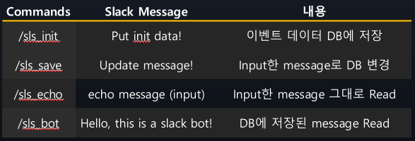 - Commands name : /sls_bot, /sls_echo, /sls_init, /sls_save