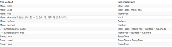 | Free | 현재 시스템에서 사용하지 않은 메모리 용량 |