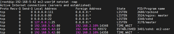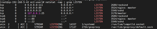 3. 'LISTEN' 포트의 네트워크 연결상태확인 : netstat -nap | grep LISTEN