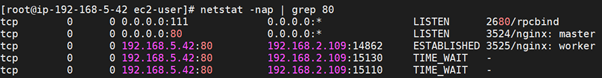 2. '특정' 포트의 네트워크 연결상태확인 : n etstat -nap | grep 80