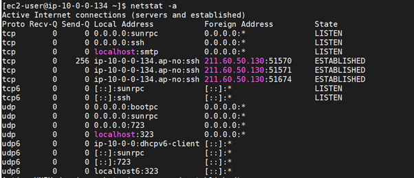 | Send-Q | 보내는 큐 (보내는 패킷의 socket buffer size) |