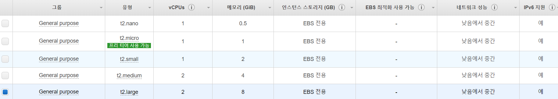 그리고 프리티어로 t2.micro사용했는데 CPU 2개이상 조건이라 인스턴스 타입 t2.large로 변경
