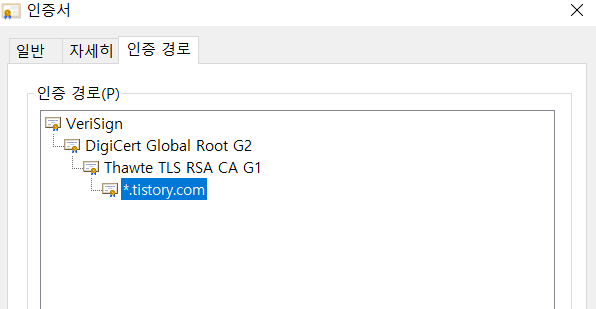 인증경로 및 인증상태 : 현재 발급대상부터 가장 신뢰할 수 있는 루트CA까지 tree경로