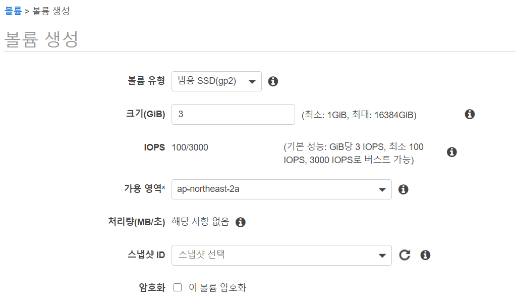 - '암호화' : AWS KMS 마스터키를 사용해서 암호화된 볼륨생성 가능