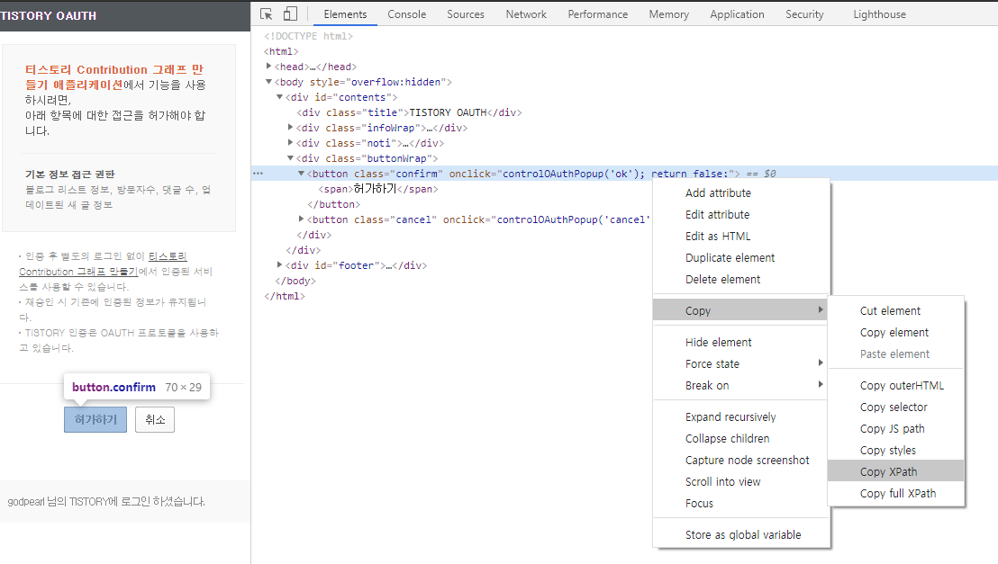 현재 리다이렉션 페이지에서 허가버튼을 누르려고 xpath를 가져오는데 오류발생