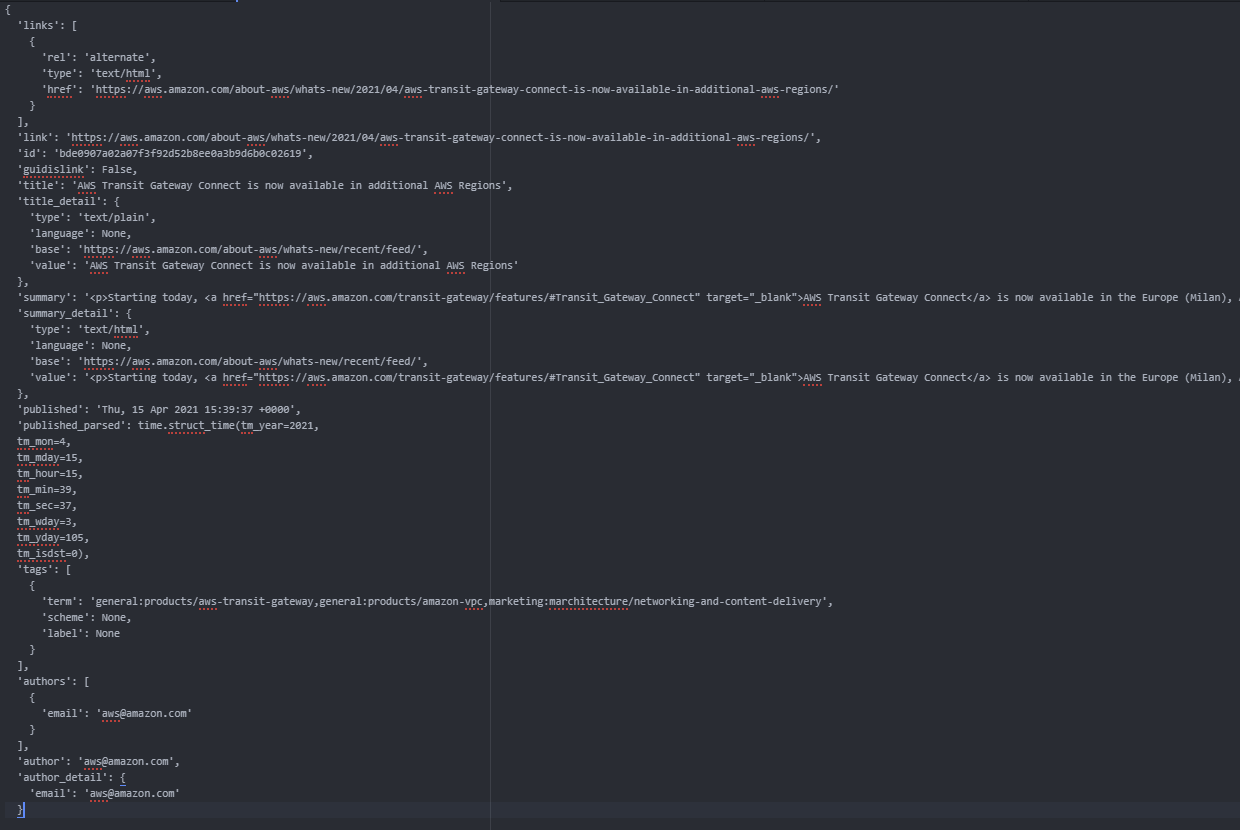 AWS 소식은 RSS로 되어 있어서 feedparser로 쉽게 긁어올수 있었다.