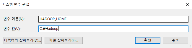 새 시트템변수 생성 : hadoop의 /bin/winutils.exe 이 있는 경로