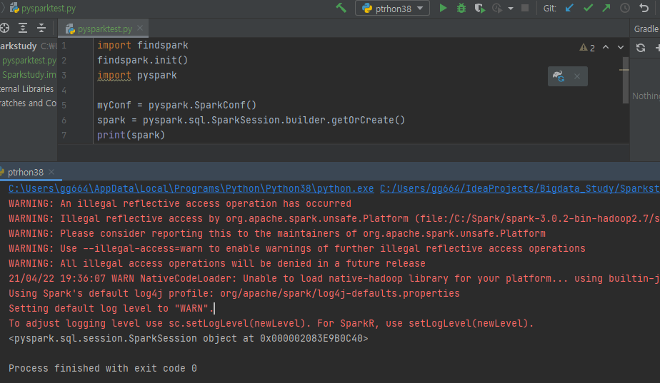 이제 다시 처음으로 돌아와서 pyspark를 import한 파이썬코드를 실행시켜본다.