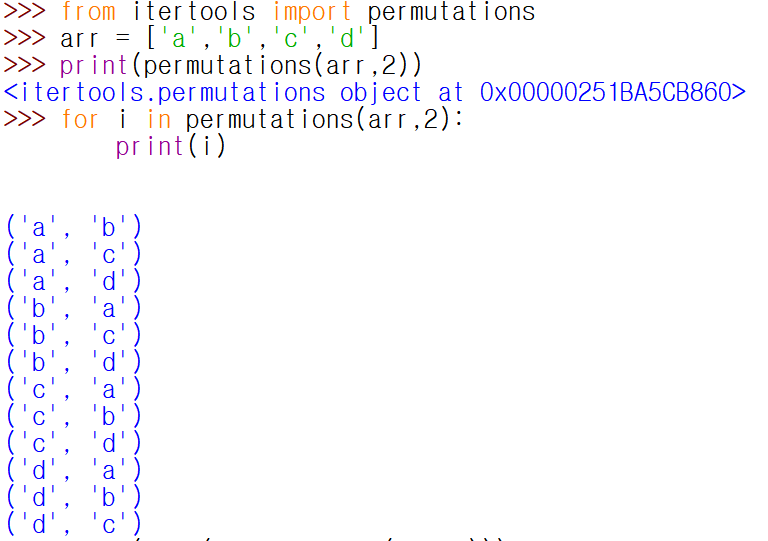 - 형식 : permutations(객체, r) 반복가능한 객체(리스트,튜플,문자열)안에서 r개를 선택한다