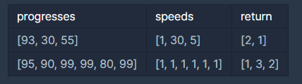- 작업의 개수(progresses, speeds배열의 길이)는 100개 이하입니다.