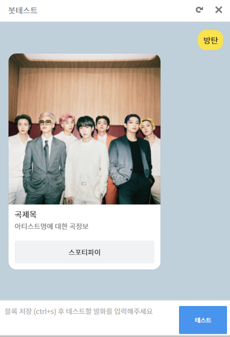 위에서 설정한 예상된 아티스트명이 검색이 되었을때 봇이 어떻게 응답할지도 설정해준다.