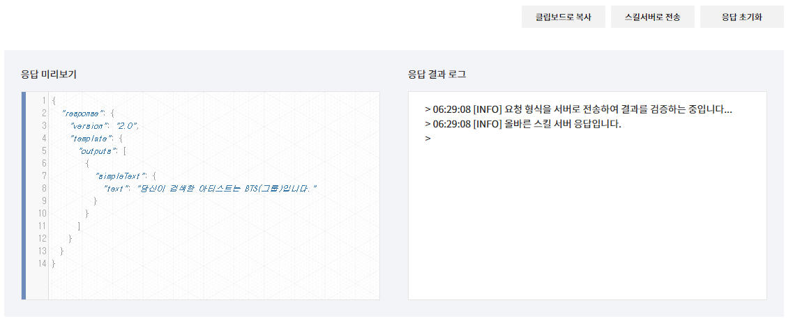 위에서 확인한 request를 바로 스킬서버로 전송한 결과를 확인할 수 있다.