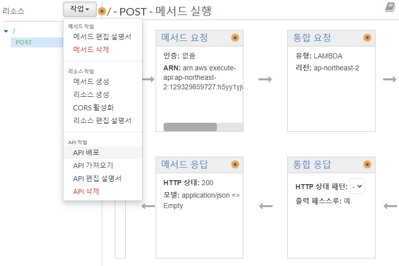 즉, api 게이트웨이의 URL로 어떠한 요청이 들어오면 이제 람다가 동작하게 만드는 작업이다.