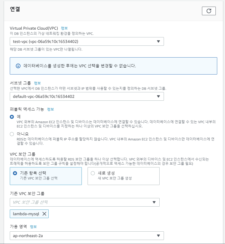그래서 RDS를 생성하고, Lambda코드를 업데이트 했다.