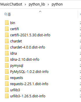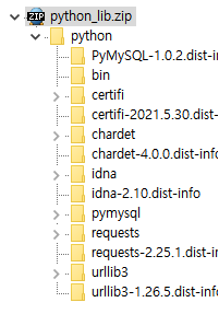 여기에서 주의해야할게 zip파일의 가장 상위경로가 python 폴더이고, 그 안에 패키지들이 있어야한다.