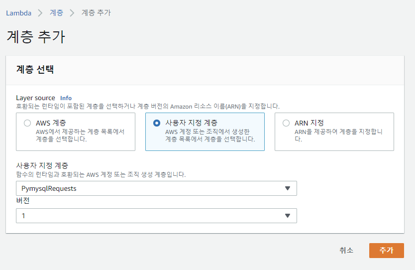 그래서 패키지를 lambda에 넣어줘야하는데 이떄 layer를 추가해주면 된다.