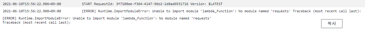 람다에서 python을 실행하는데 이런 오류가 났다면? 패키지가 없는것이다!