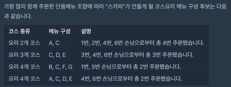 - 만약 가장 많이 함께 주문된 메뉴 구성이 여러 개라면, 모두 배열에 담아 return 하면 됩니다.