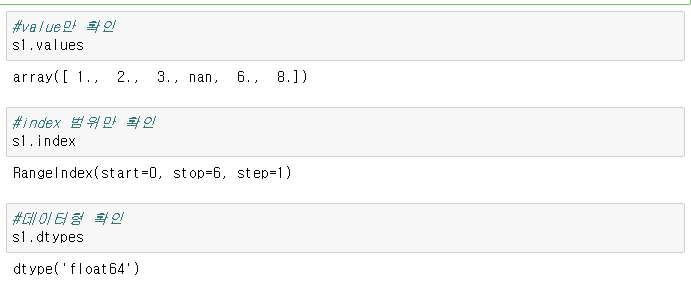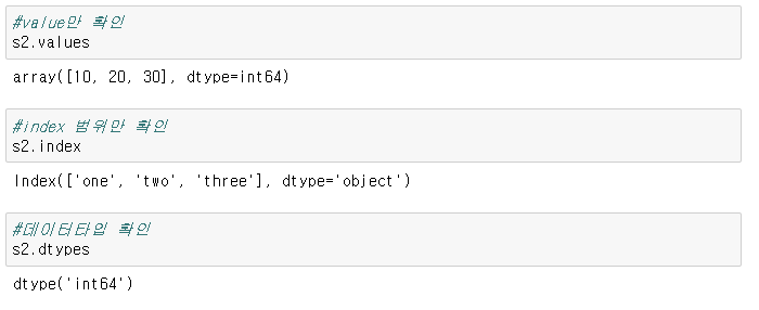 오른쪽은 index를 직접 명시해서 정의한 series(s2)에 대한 확인결과이다.