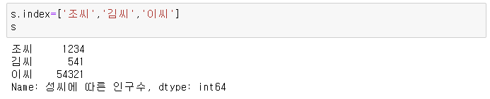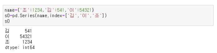 오른쪽은 index를 김/이/조 순서대로 직접 명시해서 정의한 series결과이다.