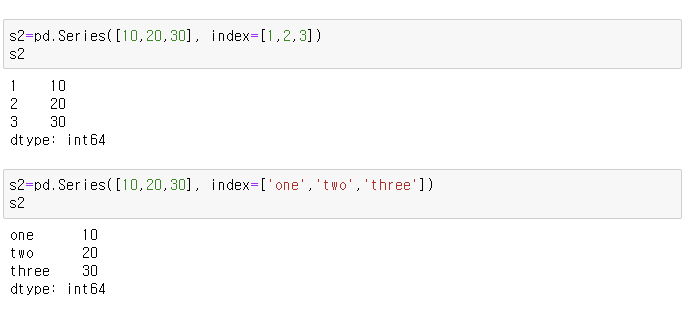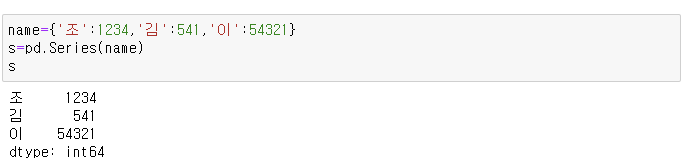 왼쪽결과는 일반적인 series를 정의한 경우이고, 오른쪽은 index를 직접 명시해서 정의한 경우이다.