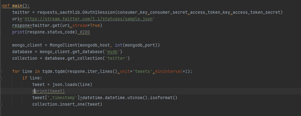 데이터 수집방법은 스트리밍 API를 사용하여 샘플링된 데이터를 실시간으로 수집하고 MongoDB에 보관한다.