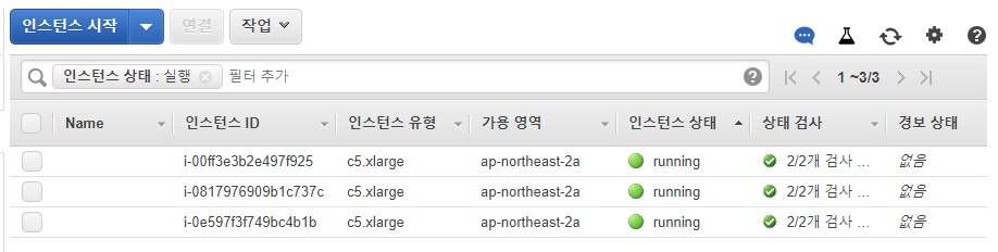 그래서 노드를 3개를 가진 클러스터를 생성하게 되면 아래처럼 ec2인스턴스가 돌아가고 있는걸 볼 수 있다.