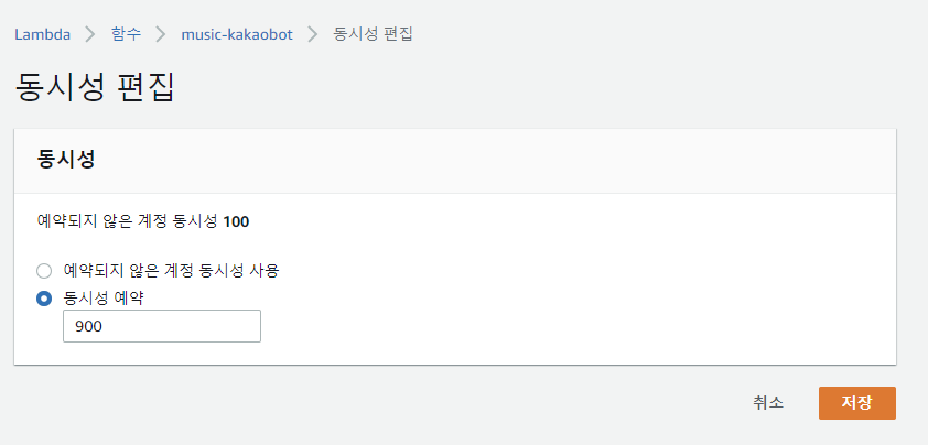 예약된 동시성으로 변경하고, 동시성 예약 값을 900으로 지정했다.