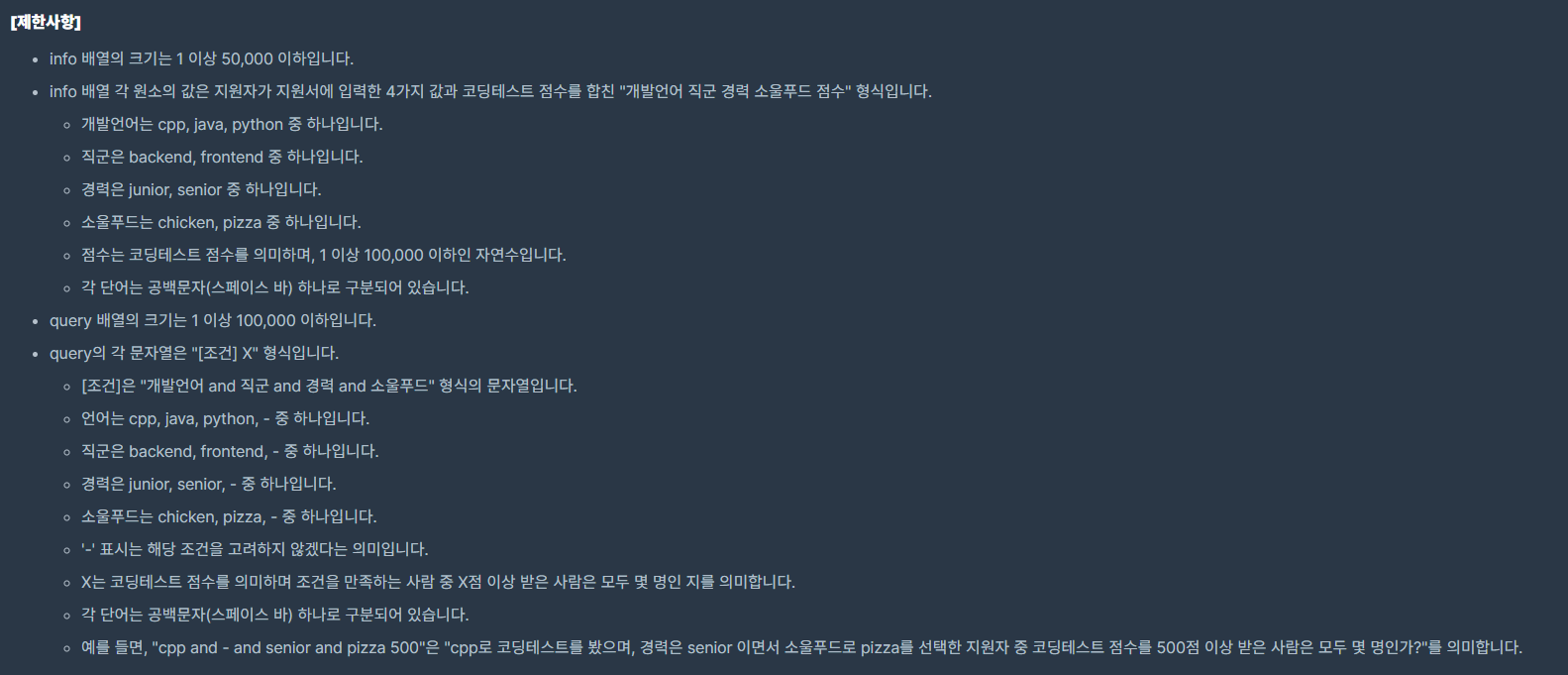 지원자가 지원서에 입력한 4가지의 정보와 획득한 코딩테스트 점수를 하나의 문자열로 구성한 값의 배열 info, 개발팀이 궁금해하는 문의조건이 문자열 형태로 담긴 배열 query가 매개변수로 주어질 때,