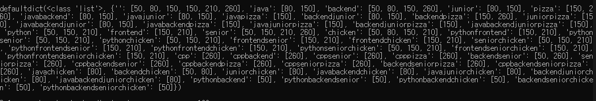 그래서 key, value로 만든 dict는 예를 들면 이런식이다. ex : {'':[전부], 'java':[80,150],.. 'javapizza':[150].....}
