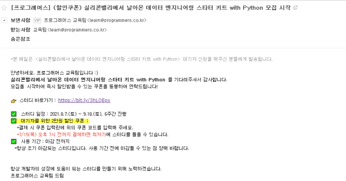 그래서 강의가 떳다하자마자 바로 결제했는데.. 결제하고보니까 이메일에 이런게 와있었다..할.인.쿠.폰