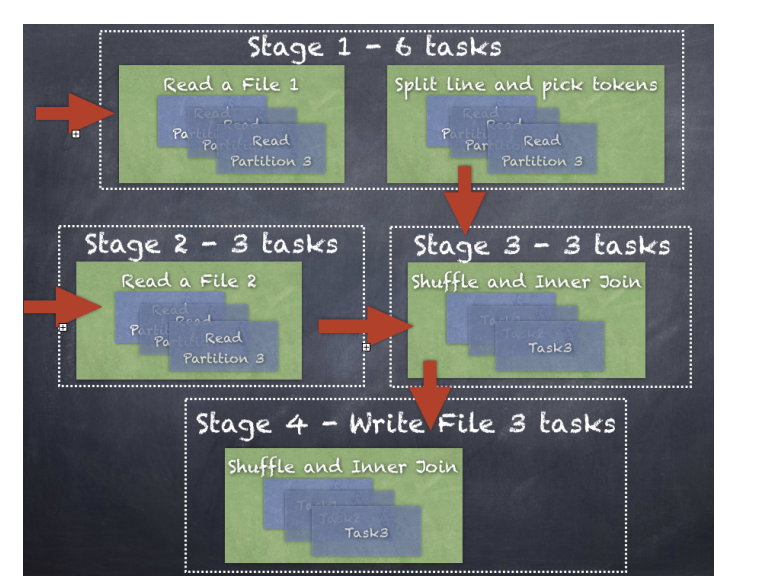 새로운 파일을 읽어서 stage2로, inner join과 같은 shuffing하는 단계로 stage3, join결과를 write하는 stage4.