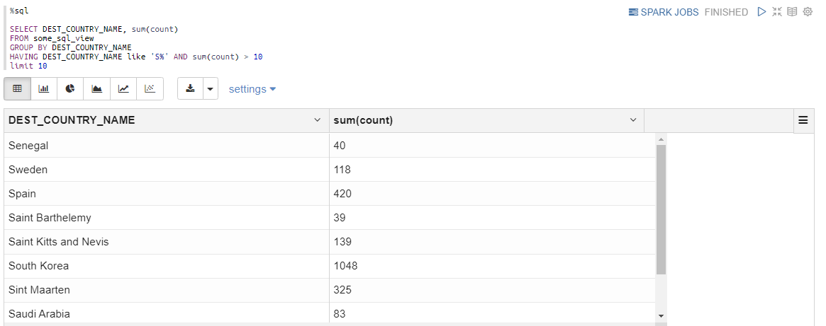 그리고 SQL수행, Zeppelin에서는 SQL에 대해서 바로 시각화 차트 및 대시보드를 제공해주어서 편리