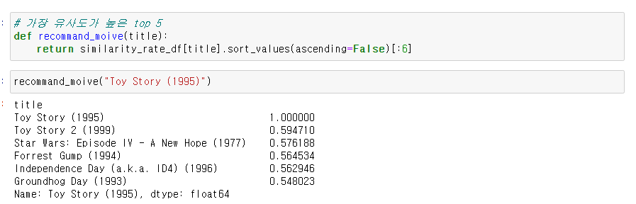 만약 사용자가 어떤 영화를 보았을때(매개변수로 영화이름 입력), 그 영화와 비슷한 영화를 추천해주는 것이다.