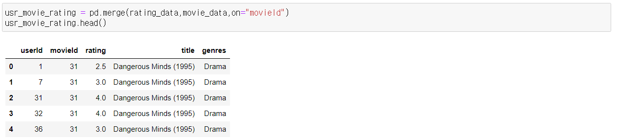 movie 데이터와 평점데이터를 merge해서 하나로 합침