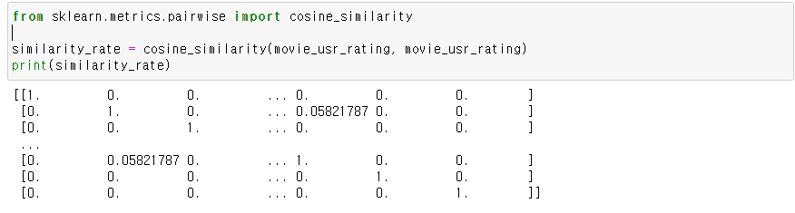 현재 평점이 data로 들어가있으니까, 이 상태에서 코사인 유사도값을 이용해 유사도를 계산한다.