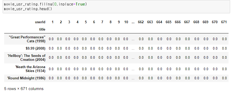 NaN은 아직 평점을 매기지 않은 것으로 볼 수 있는데, fillna를 사용해서 NaN 0으로 처리한다.