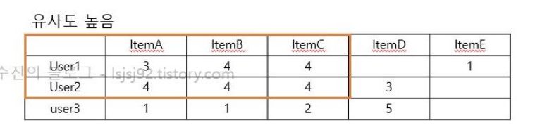 user1과 user2는 itemA,itemB,itemC까지 평점이 비슷하기 때문에 user1과 user2는 비슷하다고 판단