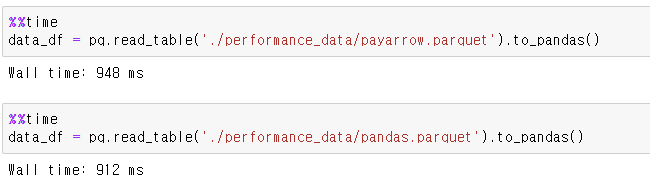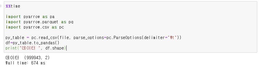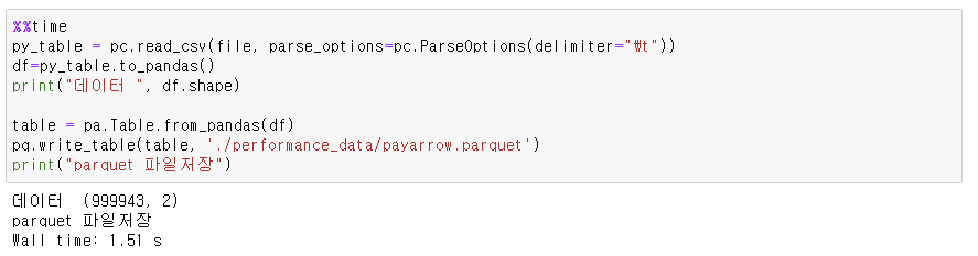 오 pandas로 읽어서 parquet로 저장하는것보다 훨씬 빠르긴하다!!
