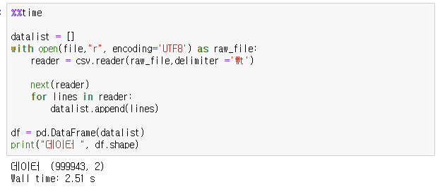오 확실히 pandas로 읽었을때보다 훨씬 빠르긴하다!