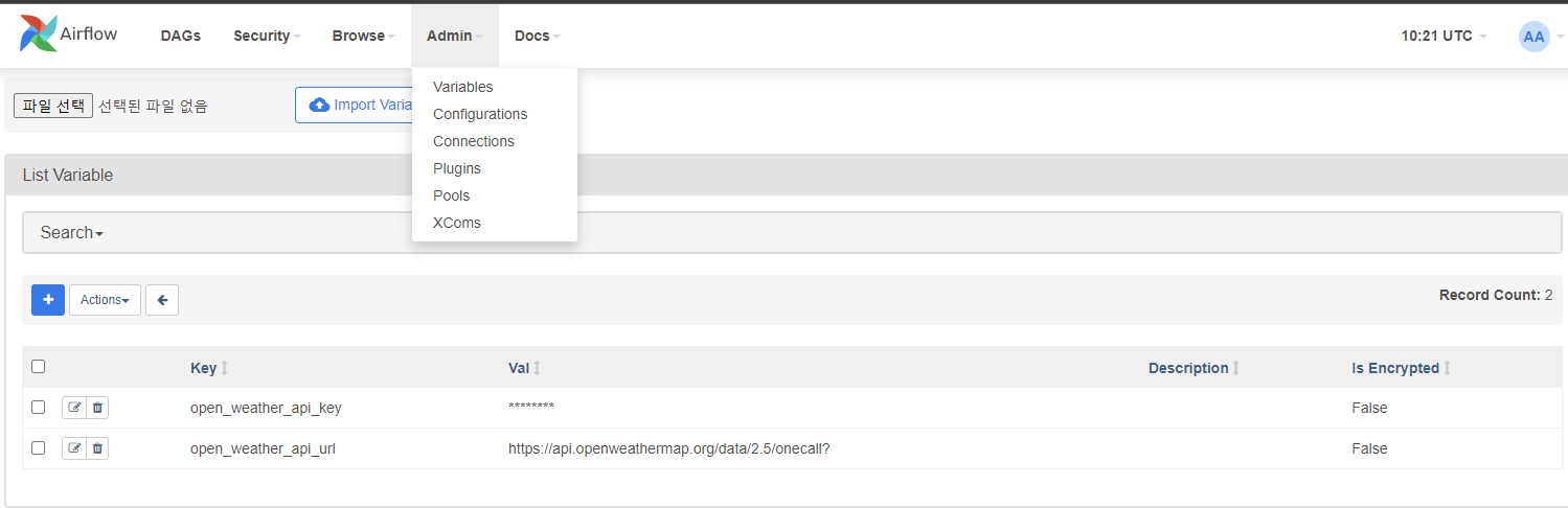 이 환경변수는 Airflow의 웹-Admin-Variables에서 직접 key와 val을 지정하면 된다.