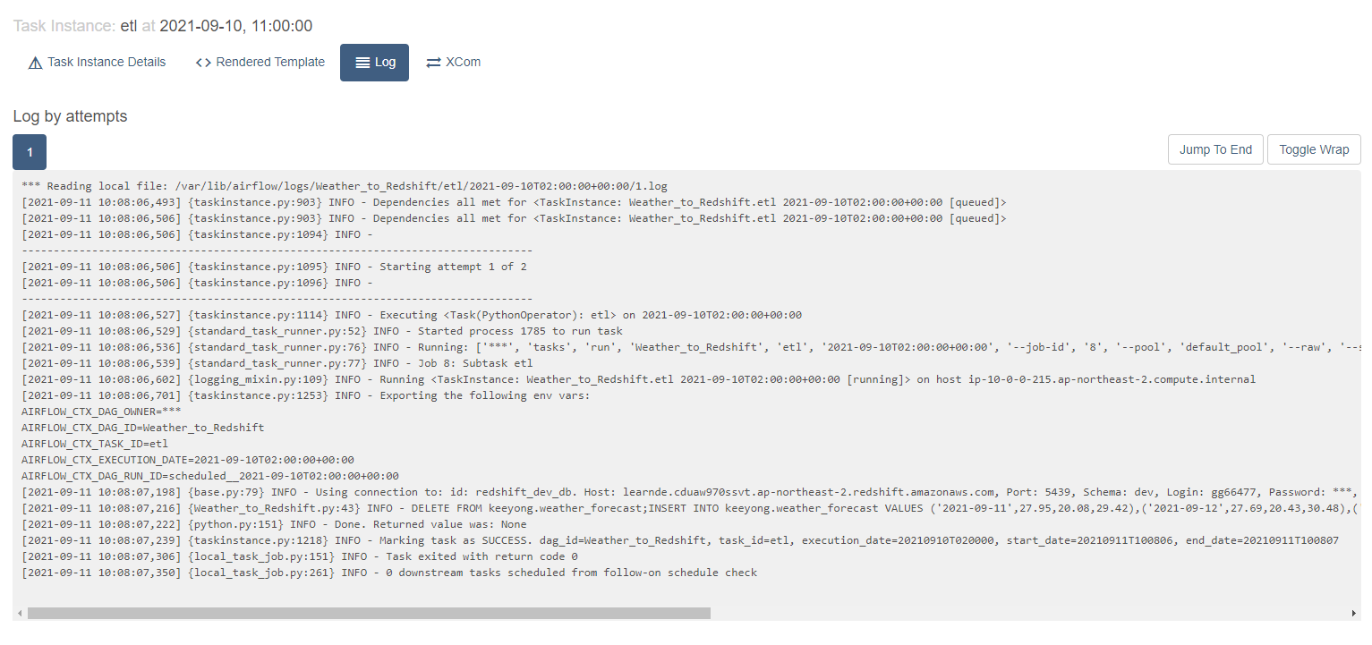 openWeatherAPI를 통해 최근7일의 날씨 데이터를 Redshift에 저장하는 하나의 파이프라인을 DAG로 작성한 것이다.