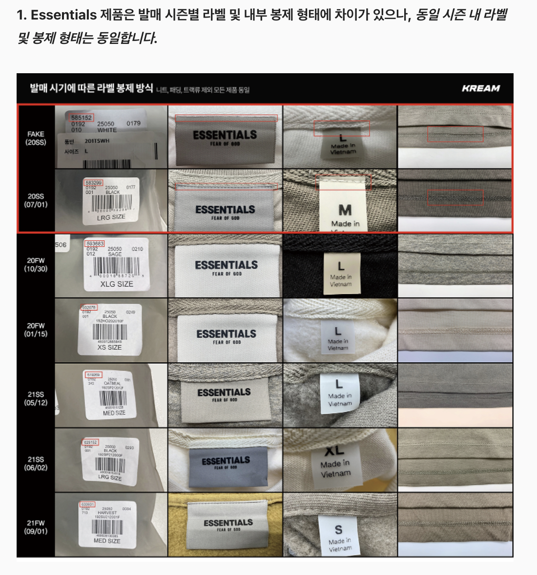 생산시기에 따라서 라벨이나 봉제형태가 다를뿐이지, 무신사가 주장하는 정품 개체 차이로는 절대 발생할 수 없다는 것!