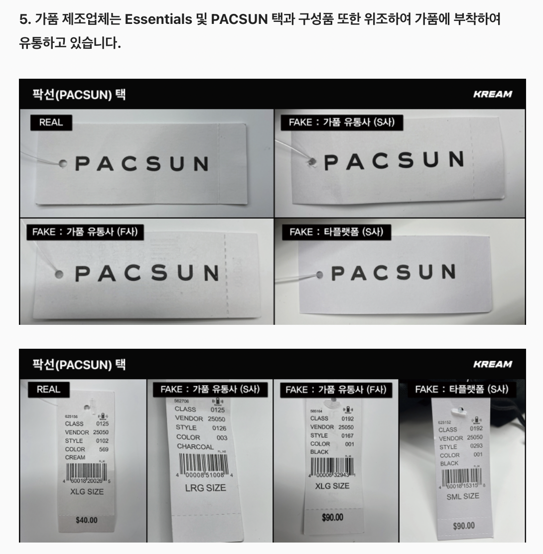 에센셜의 공식판매처인 미국유통업체 팍선(PACSUN) 및 검증기관과 정품의뢰를 했고,한국명품감정원에서도 확인해봤다고 공지했다.