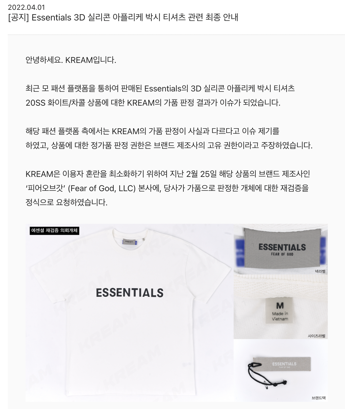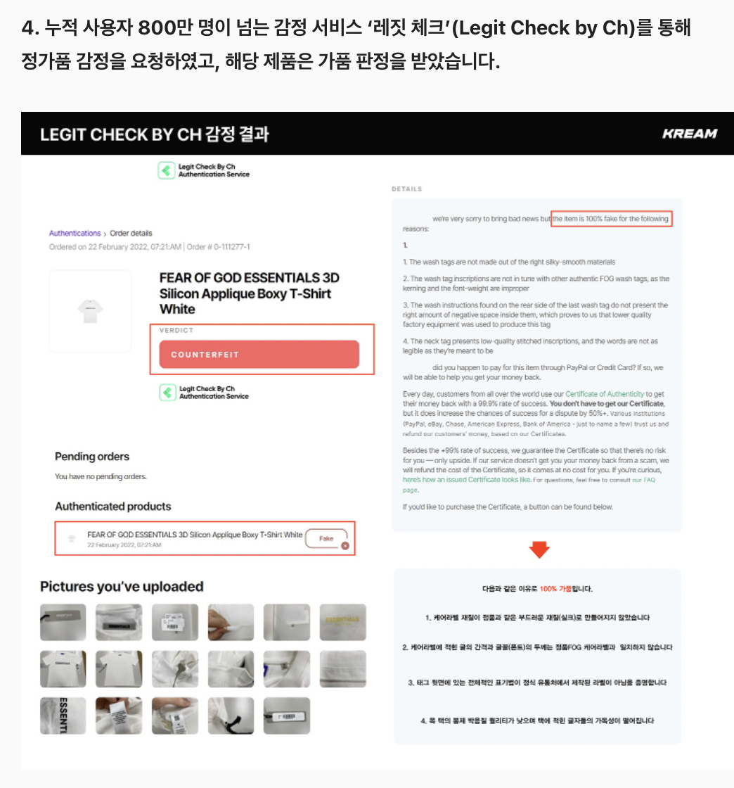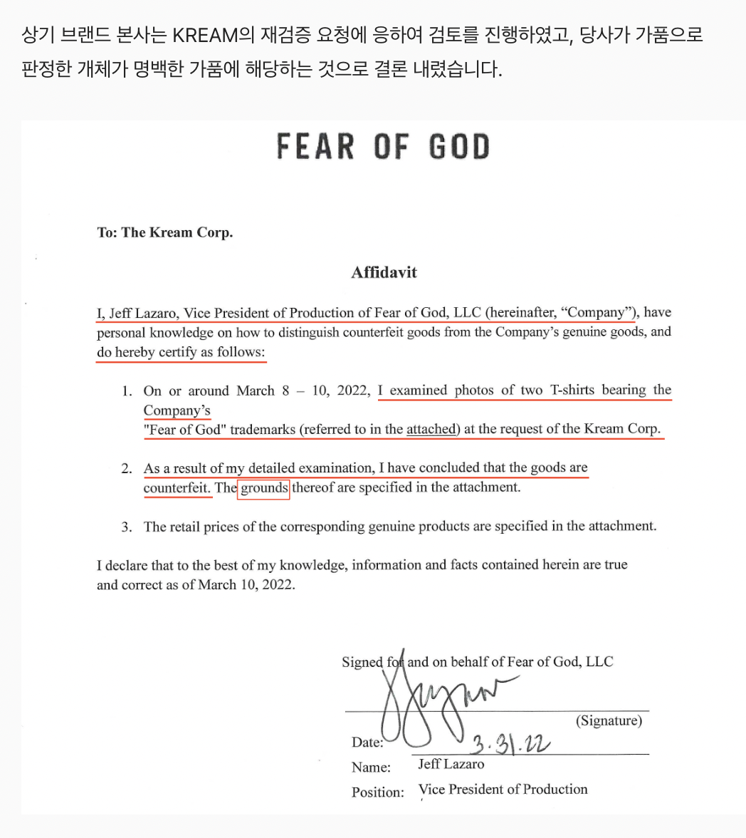 크림이 해당 제품의 제조사인 피어오브갓(Fear of God, LCC) 본사에서 가품이라는 것을 직접 확인한 것이다.