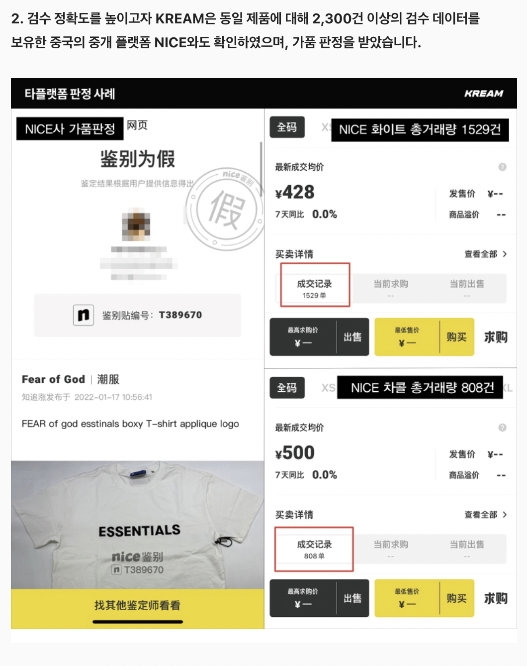 또한, 동일한 유통경로로 같은 제품을 확보해서 중국 리셀 플랫폼 NICE에서도 감정을 의뢰했는데 가품이 나왔다고 공개했다.