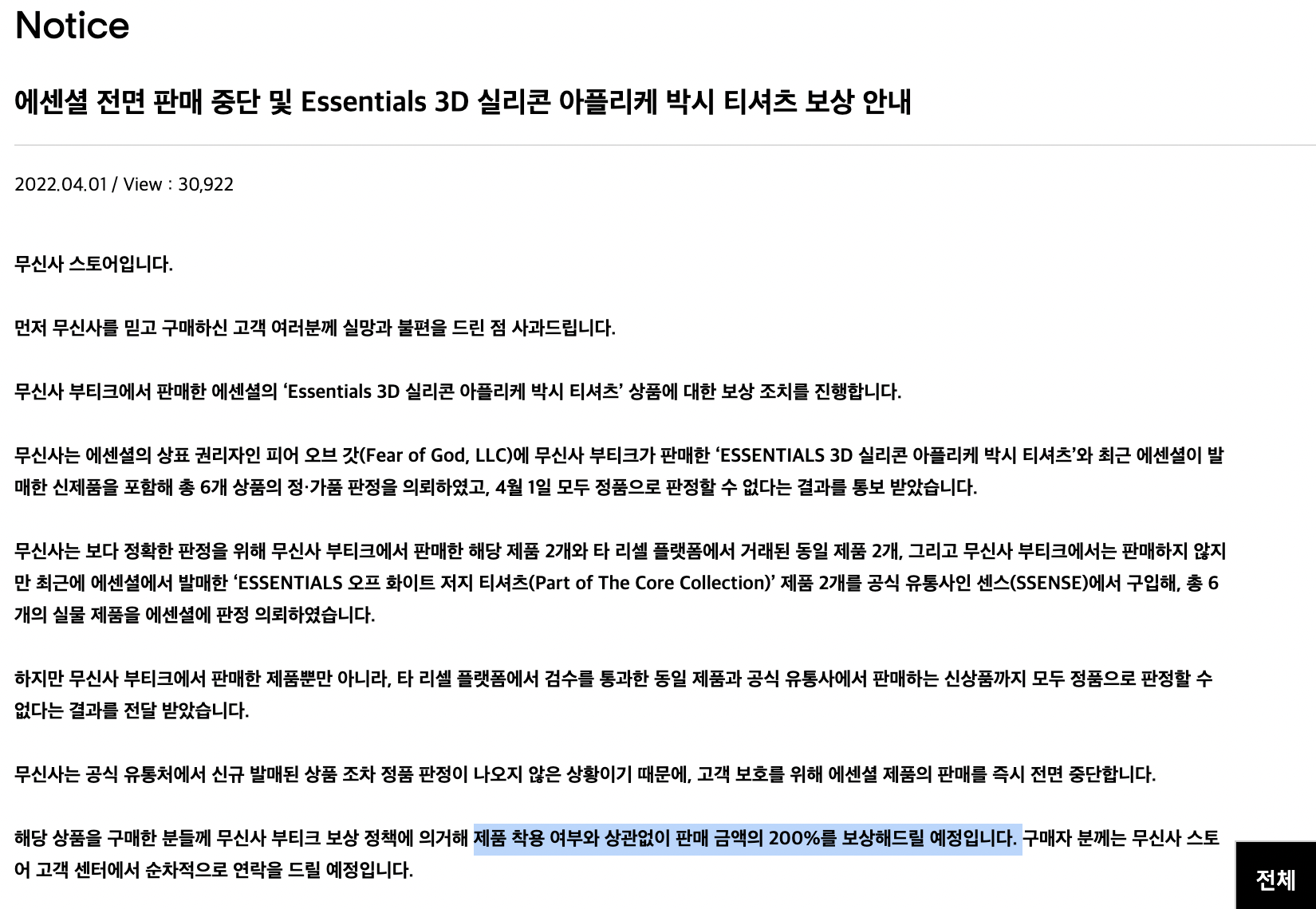 그리고 이제서야 감정의뢰결과 정품으로 판정할 수 없다며 가품을 인정하고, 해당 상품 판매금액의 200%를 보상해준다고 공지했다.