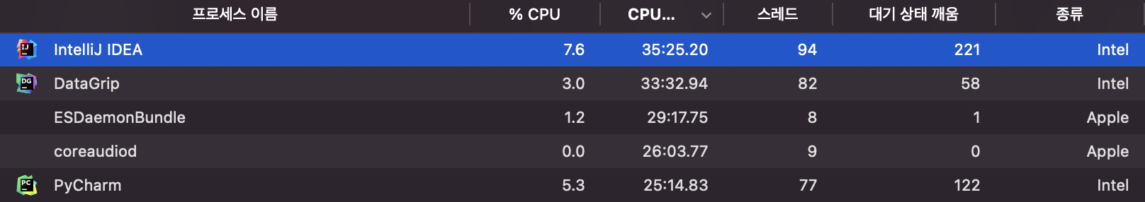 그래서 intellj뿐만 아니라 datagrip, pycharm까지 모든 jetbrain 프로그램들을 m1용으로 다시 깔았따..