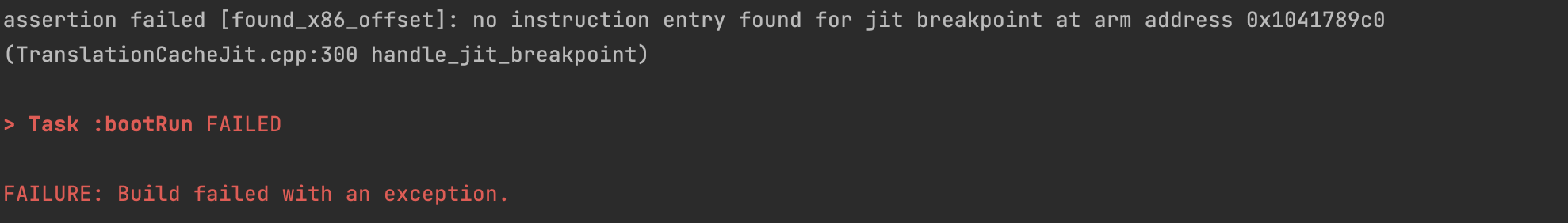 assertion failed [found_x86_offset]: no instruction entry found for jit breakpoint at arm address 0x12db71e00.