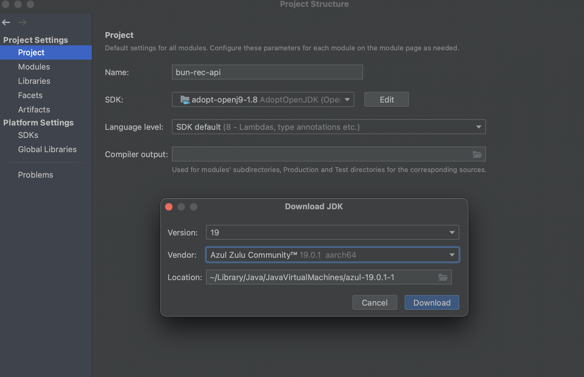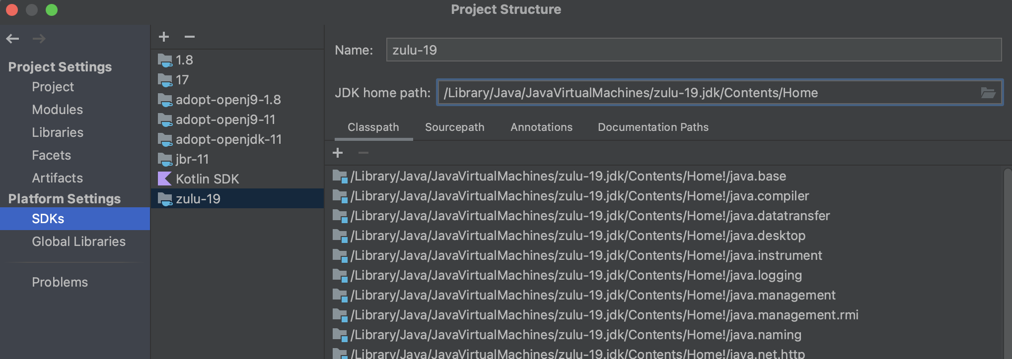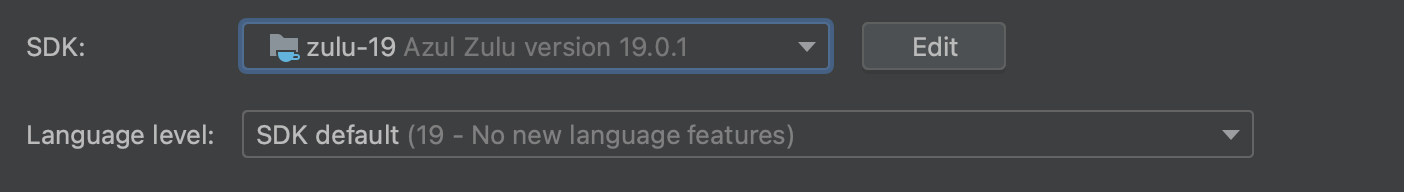 그리고 해당프로젝트에서 zulu-19 버전 sdk를 적용한다.